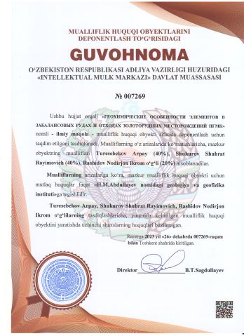 | 2832 | №007269 | Ilmiy maqola - "ГЕОХИМИЧЕСКИЕ ОСОБЕННОСТИ ЭЛЕМЕНТОВ В ЗАБАЛАНСОВЫХ РУДАХ И ОТХОДАХ ЗОЛОТОРУДНЫХ МЕСТОРОЖДЕНИЙ НГМК" | Turesebekov Arpay (40%), Shukurov Shuhrat Rayimovich (40%), Rashidov Nodirjon Ikrom o‘g‘li (20%) | H.M.Abdullayev nomidagi geologiya va geofizika instituti | 12/26/2023 | ![]() |