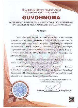 | 2823 | №007278 | Uslubiy ko‘rsatma - «MEXANIKADAN ZAMONAVIY LABORATORIYA ISHLARI» | Onarqulov Karimberdi Egamberdiyevich (40%), Zaynolobidinova Sapuraxon Malikovna (30%), Dehqonova Oxistaxon Qosimjonovna (30%) | Onarqulov Karimberdi Egamberdiyevich, Zaynolobidinova Sapuraxon Malikovna, Dehqonova Oxistaxon Qosimjonovna | 26.12.2023 | ![]() |