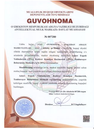 | 2821 | №007280 | Uslubiy qo‘llanma - «FUNKSIONAL ANALIZDAN AMALIY MASHG‘ULOTLAR» | Azizov Ergash Yuldashevich (35%), Kodirov Komiljon Raximovich (35%), Toshbuvayev Boburmirzo Mashrab o‘g‘li (30%) | Azizov Ergash Yuldashevich, Kodirov Komiljon Raximovich, Toshbuvayev Boburmirzo Mashrab o‘g‘li | 26.12.2023 | ![]() |