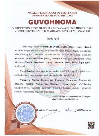 | 2853 | №007248 | Darslik - "FARMATSEVTIK INJINIRING" | Yusupova Nasiba Fattaxovna (25%), Tuxtayev Farxodjon Xakimovich (25%), Abzalova Nodira Akmalevna (25%), Qayumov Feruz Sobir o‘g‘li (25%) | Yusupova Nasiba Fattaxovna, Tuxtayev Farxodjon Xakimovich, Abzalova Nodira Akmalevna, Qayumov Feruz Sobir o‘g‘li | 12/21/2023 | ![]() |