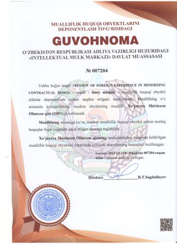 | 2897 | №007204 | Ilmiy maqola - "REVIEW OF FOREIGN EXPERIENCE IN MINIMIZING CONTRACTUAL RISKS" | Xo‘jayeva Shirinxon Olimxon qizi (100%) | Xo‘jayeva Shirinxon Olimxon qizi | 12/19/2023 | ![]() |