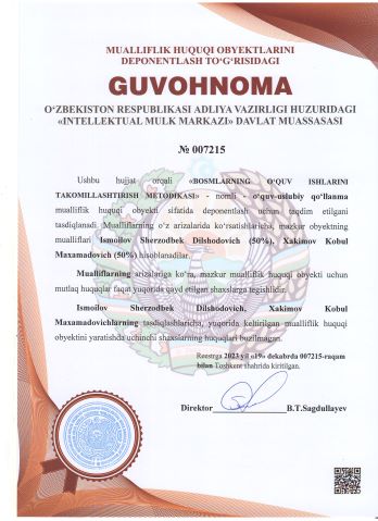 | 2886 | №007215 | O‘quv-uslubiy qo‘llanma - «BOSMLARNING O‘QUV ISHLARINI TAKOMILLASHTIRISH METODIKASI» | Ismoilov Sherzodbek Dilshodovich (50%), Xakimov Kobul Maxamadovich (50%) | Ismoilov Sherzodbek Dilshodovich, Xakimov Kobul Maxamadovich | 19.12.2023 | ![]() |
