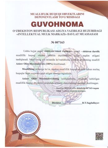 | 2938 | №007163 | Elektron darslik - "ФИНАНСОВЫЕ РЫНКИ" | Azizov Olim Maxmudovich (100%) | Azizov Olim Maxmudovich | 12/14/2023 | ![]() |