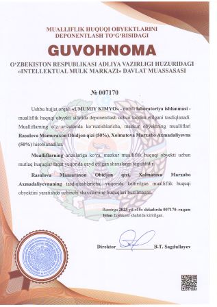 | 2931 | №007170 | Laboratoriya ishlanmasi - «UMUMIY KIMYO» | Rasulova Mamuraxon Obidjon qizi (50%), Xolmatova Marxabo Axmadaliyevna (50%) | Rasulova Mamuraxon Obidjon qizi, Xolmatova Marxabo Axmadaliyevna | 15.12.2023 | ![]() |