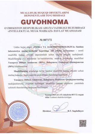 | 2929 | №007172 | «FIZIKA VA AGROMETEREOLOGIYA» fanidan laboratoriya mashg‘ulotlarini bajarishga oid uslubiy ko‘rsatma» | Yusupova Dilfuza Aminovna (50%), Dehqonova Oxistaxon Qosimjonovna (50%) | Yusupova Dilfuza Aminovna, Dehqonova Oxistaxon Qosimjonovna | 15.12.2023 | ![]() |