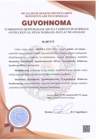 | 2928 | №007173 | Uslubiy ko‘rsatma - «IZOHLI LUG‘AT» | Onarkulov Karimberdi Egamberdiyevich (50%), G‘aynazarova Kizlarxon Isroilovna (50%) | Onarkulov Karimberdi Egamberdiyevich, G‘aynazarova Kizlarxon Isroilovna | 15.12.2023 | ![]() |