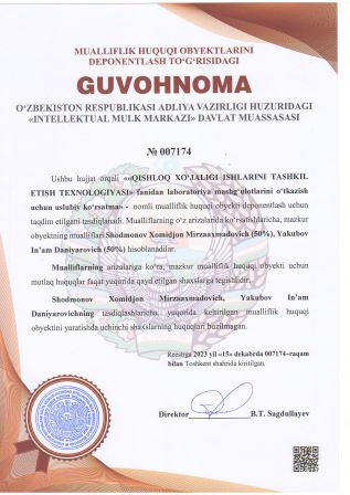 | 2927 | №007174 | ««QISHLOQ XO‘JALIGI ISHLARINI TASHKIL ETISH TEXNOLOGIYASI» fanidan laboratoriya mashg‘ulotlarini o‘tkazish uchun uslubiy ko‘rsatma» | Shodmonov Xomidjon Mirzaaxmadovich (50%), Yakubov In’am Daniyarovich (50%) | Shodmonov Xomidjon Mirzaaxmadovich, Yakubov In’am Daniyarovich | 15.12.2023 | ![]() |