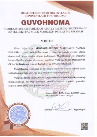 | 2926 | №007175 | Uslubiy ko‘rsatma - «IJODKORLIKNING ZAMONAVIY AMALIY ISHLARI» | Yakubov In’am Daniyarovich (50%), Xojikarimova Gulasal Tadjialiyevna (50%) | Yakubov In’am Daniyarovich, Xojikarimova Gulasal Tadjialiyevna | 15.12.2023 | ![]() |