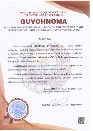 | 2925 | №007176 | Uslubiy qo‘llanma - «KARRALI INTEGRALLAR» | Gaziyev Kobiljon Solijonovich (50%), Nishonova Shaxnozaxon Toxirjon qizi (50%) | Gaziyev Kobiljon Solijonovich, Nishonova Shaxnozaxon Toxirjon qizi | 15.12.2023 | ![]() |