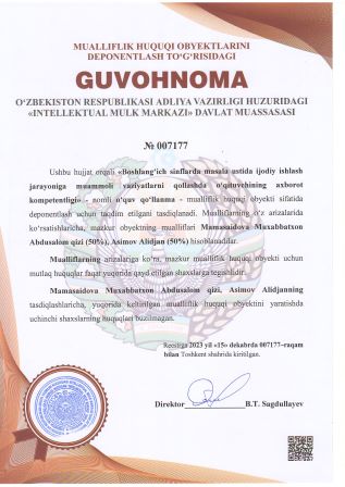 | 2924 | №007177 | O‘quv qo‘llanma - «Boshlang‘ich sinflarda masala ustida ijodiy ishlash jarayoniga muammoli vaziyatlarni qollashda o‘qituvchining axborot kompetentligi» | Mamasaidova Muxabbatxon Abdusalom qizi (50%), Asimov Alidjan (50%) | Mamasaidova Muxabbatxon Abdusalom qizi, Asimov Alidjan | 15.12.2023 | ![]() |