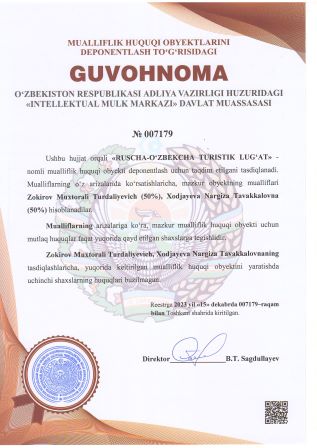 | 2922 | №007179 | «RUSCHA-O‘ZBEKCHA TURISTIK LUG‘AT» | Zokirov Muxtorali Turdaliyevich (50%), Xodjayeva Nargiza Tavakkalovna (50%) | Zokirov Muxtorali Turdaliyevich, Xodjayeva Nargiza Tavakkalovna | 15.12.2023 | ![]() |