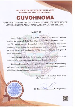 | 2921 | №007180 | ««EKONOMETRIKA ASOSLARI» fanidan laboratoriya mashg‘ulotlarini bajarishga doir uslubiy ko‘rsatma» | Raximova Kizlarxon Nematjon qizi (50%), Mirzayev Abdullajon Topilovich (50%) | Raximova Kizlarxon Nematjon qizi, Mirzayev Abdullajon Topilovich | 15.12.2023 | ![]() |