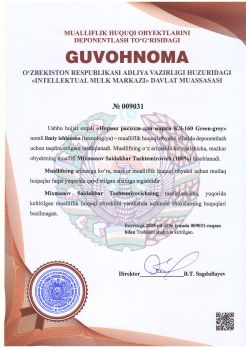 292 | №009031 | Ilmiy ishlanma (texnologiya) – "Нормы расхода для марки КЛ-160 Green-grey" | Mixmanov Saidakbar Tashtemirovich (100%) | Mixmanov Saidakbar Tashtemirovich | 19.06.2025 | ![]() |