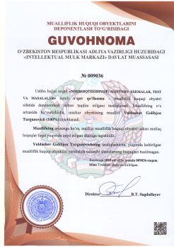 290 | №009033 | Ilmiy ishlanma – "LOYIHAVIY-FAOLIYAT INNOVATSION METODI" | Rasulova Tursunoy Pazildjanovna (50%), Yusupov Muxtorjon Tojiboyevich (50%) | Rasulova Tursunoy Pazildjanovna, Yusupov Muxtorjon Tojiboyevich | 23.06.2025 | ![]() |