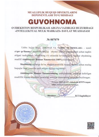 | 3022 | №007079 | O‘quv qo‘llanma - "ASLIYAT VA TABDIL MUAMMOLARI" | Abdulxayrov Manzar Xusanovich (100%) | Abdulxayrov Manzar Xusanovich | 12/07/2023 | ![]() |