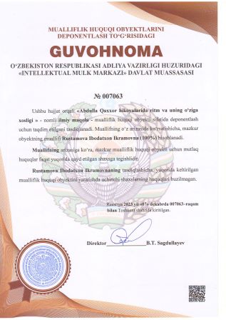 | 3031 | №007070 | Tarjima asar - «HAZINIY HOKANDIY. Living legend of Fergana valley. His life and literary works» | Axmedova Matlubaxon Ibragimjonovna (100%) | Axmedova Matlubaxon Ibragimjonovna | 07.12.2023 | ![]() |