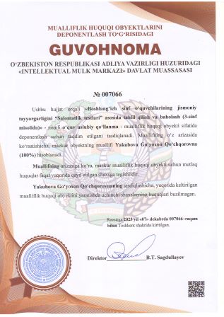 | 3035 | №007066 | O‘quv uslubiy qo‘llanma - «Boshlang‘ich sinf o‘quvchilarining jismoniy tayyorgarligini “Salomatlik testlari” asosida tahlil qilish va baholash (3-sinf misolida)» | Yakubova Go‘yoxon Qo‘chqorovna (100%) | Yakubova Go‘yoxon Qo‘chqorovna | 07.12.2023 | ![]() |