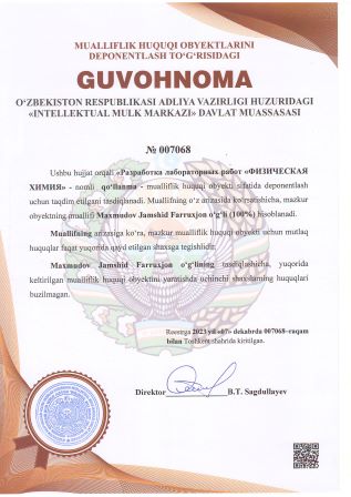 | 3033 | №007068 | Qo‘llanma - «Разработка лабораторных работ «ФИЗИЧЕСКАЯ ХИМИЯ» | Maxmudov Jamshid Farruxjon o‘g‘li (100%) | Maxmudov Jamshid Farruxjon o‘g‘li | 07.12.2023 | ![]() |