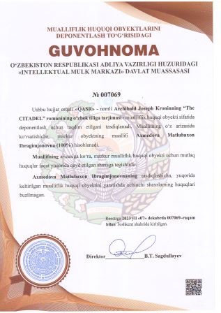| 3032 | №007069 | Archibald Joseph Kroninning “The CITADEL” romanining o‘zbek tiliga tarjimasi - «QASR» | Axmedova Matlubaxon Ibragimjonovna (100%) | Axmedova Matlubaxon Ibragimjonovna | 07.12.2023 | ![]() |