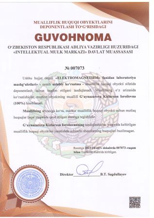 | 3028 | №007073 | Uslubiy ko‘rsatma - «ELEKTROMAGNETIZM» fanidan laboratoriya mashg‘ulotlari» | G‘aynazarova Kizlarxon Isroilovna (100%) | G‘aynazarova Kizlarxon Isroilovna | 07.12.2023 | ![]() |