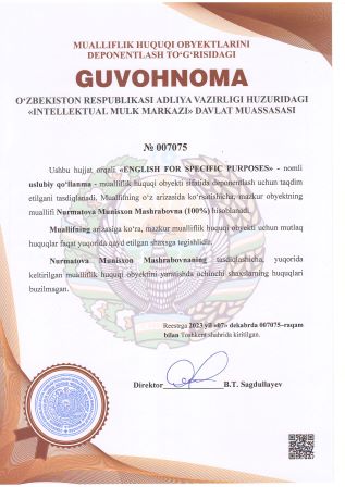 | 3026 | №007075 | Uslubiy qo‘llanma - «ENGLISH FOR SPECIFIC PURPOSES» | Nurmatova Munisxon Mashrabovna (100%) | Nurmatova Munisxon Mashrabovna | 07.12.2023 | ![]() |