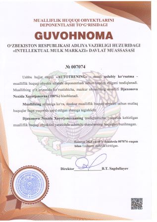 | 3027 | №007074 | Uslubiy ko‘rsatma - «AUTOTRENING» | Djuxonova Noxida Xayotjonovna (100%) | Djuxonova Noxida Xayotjonovna | 07.12.2023 | ![]() |