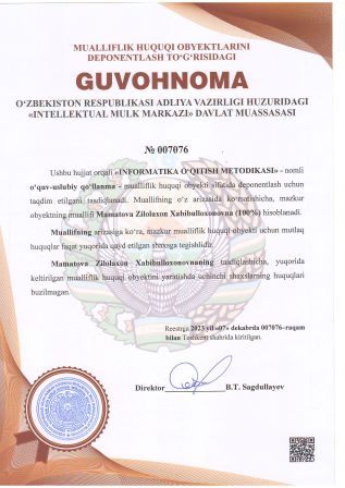 | 3025 | №007076 | O‘quv-uslubiy qo‘llanma - «INFORMATIKA O‘QITISH METODIKASI» | Mamatova Zilolaxon Xabibulloxonovna (100%) | Mamatova Zilolaxon Xabibulloxonovna | 07.12.2023 | ![]() |