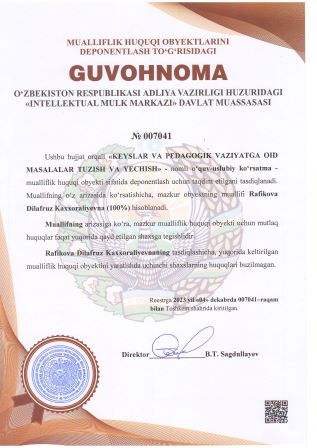 | 3060 | №007041 | O‘quv-uslubiy ko‘rsatma - «KEYSLAR VA PEDAGOGIK VAZIYATGA OID MASALALAR TUZISH VA YECHISH» | Rafikova Dilafruz Kaxxoraliyevna (100%) | Rafikova Dilafruz Kaxxoraliyevna | 04.12.2023 | ![]() |