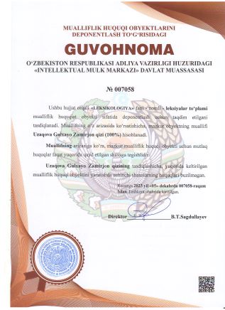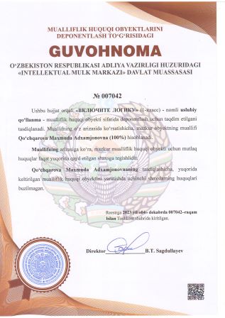 | 3059 | №007042 | Uslubiy qo‘llanma - «ВКЛЮЧИТЕ ЛОГИКУ» (1-класс) | Qo‘chqarova Maxmuda Adxamjonovna (100%) | Qo‘chqarova Maxmuda Adxamjonovna | 04.12.2023 | ![]() |