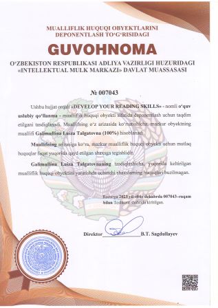 | 3058 | №007043 | O‘quv uslubiy qo‘llanma - «DEVELOP YOUR READING SKILLS» | Galimullina Luiza Talgatovna (100%) | Galimullina Luiza Talgatovna | 04.12.2023 | ![]() |