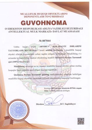 | 3057 | №007044 | Uslubiy ko‘rsatma - «BITIRUV MALAKAVIY ISHLARINI TAYYORLASH BO‘YICHA» | Qosimova Feruza Xursanali qizi (100%) | Qosimova Feruza Xursanali qizi | 04.12.2023 | ![]() |