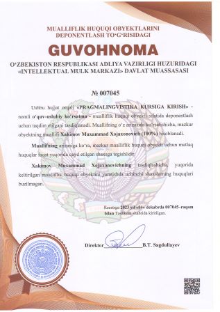 | 3056 | №007045 | O‘quv-uslubiy ko‘rsatma - «PRAGMALINGVISTIKA KURSIGA KIRISH» | Xakimov Muxammad Xojaxonovich (100%) | Xakimov Muxammad Xojaxonovich | 04.12.2023 | ![]() |