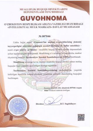 | 3055 | №007046 | O‘quv-uslubiy qo‘llanma - «Umumta’lim maktab o‘quvchilarining jismoniy tayyorgarligini oshirishni pedagogik asoslari (boslang‘ich sinflar misolida)» | Xaydaraliyev Xurshid Xamidulloyevich (100%) | Xaydaraliyev Xurshid Xamidulloyevich | 04.12.2023 | ![]() |