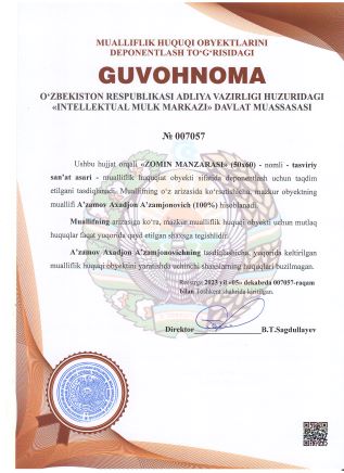 | 3044 | №007057 | Tasviriy san’at asari - «ZOMIN MANZARASI» (50x60) | A’zamov Axadjon A’zamjonovich (100%) | A’zamov Axadjon A’zamjonovich | 05.12.2023 | ![]() |