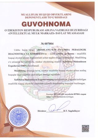 | 3097 | №007004 | Uslubiy qo‘llanma - «BOSHLANG‘ICH TA’LIMDA PEDAGOGIK DIAGNOSTIKA VA KORREKSIYA» | Xallokova Maksudaxon Ergashevna (100%) | Xallokova Maksudaxon Ergashevna | 29.11.2023 | ![]() |