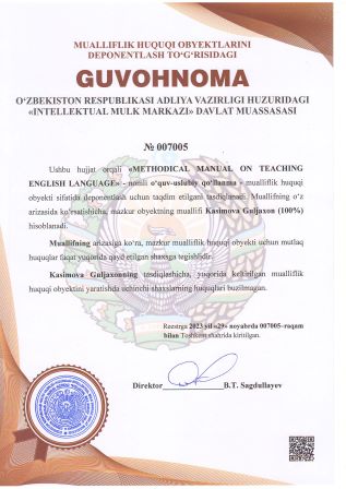 | 3091 | №007010 | Uslubiy ko‘rsatma - «Chet tillarini o‘qitishda qo‘llaniladigan pedagogik texnologoyalar» | Saminjonov Muxammadali Salimjon o‘g‘li (100%) | Saminjonov Muxammadali Salimjon o‘g‘li | 29.11.2023 | ![]() |