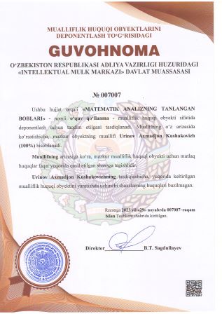 | 3093 | №007008 | O‘quv qo‘llanma - «MAXSUS FUNKSIYALAR VA MAXSUS OPERATORLAR» | Urinov Axmadjon Kushakovich (100%) | Urinov Axmadjon Kushakovich | 29.11.2023 | ![]() |
