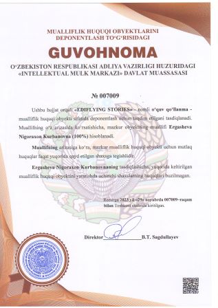 | 3092 | №007009 | O‘quv qo‘llanma - «EDIFLYING STORIES» | Ergasheva Nigoraxon Kurbanovna (100%) | Ergasheva Nigoraxon Kurbanovna | 29.11.2023 | ![]() |