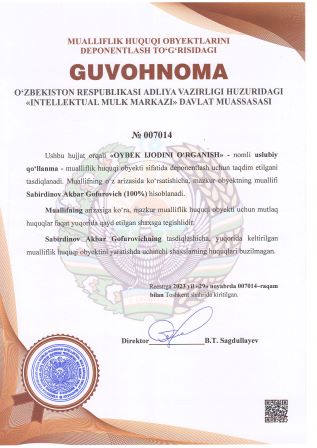 | 3087 | №007014 | Uslubiy qo‘llanma - «OYBEK IJODINI O‘RGANISH» | Sabirdinov Akbar Gofurovich (100%) | Sabirdinov Akbar Gofurovich | 29.11.2023 | ![]() |