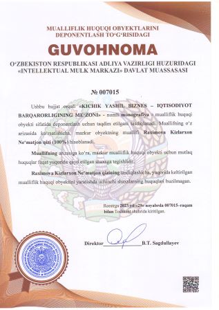 | 3086 | №007015 | Monografiya - «KICHIK YASHIL BIZNES – IQTISODIYOT BARQARORLIGINING ME‘ZONI» | Raximova Kizlarxon Ne‘matjon qizi (100%) | Raximova Kizlarxon Ne‘matjon qizi | 29.11.2023 | ![]() |