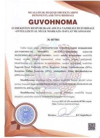 | 3100 | №007001 | Uslubiy tavsiyanoma - "МЕТОДИЧЕСКИЕ РЕКОМЕНДАЦИИ ПОВЫШЕНИЯ ДОСТОВЕРНОСТИ ПРОГНОЗА ЭКСПЛУАТАЦИОННЫХ ЗАПАСОВ ПОДЗЕМНЫХ ВОД ПРИ ИХ ОЦЕНКЕ" | Nagevich Pavel Pavlovich (25%), Sergeyeva Yelena Vyacheslavovna (25%), Karpizina Galina Ivanovna (25%), Abdujalilova Zilola Ravshanbekovna (25%) | "GIDROGEOLOGIYA VA INJENERLIK GEOLOGIYASI INSTITUTI" DM | 11/29/2023 | ![]() |