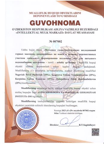 | 3099 | №007002 | Uslubiy qo‘llanma - "Методика гидрогеологических исследований горных массивов, направленных на поиск и разведку перспективных участков локального формирования подземных вод для питъевого водоснабжения населения" | Nagevich Pavel Pavlovich (25%), Sergeyeva Yelena Vyacheslavovna (25%), Karpizina Galina Ivanovna (25%), Abdujalilova Zilola Ravshanbekovna (25%) | "GIDROGEOLOGIYA VA INJENERLIK GEOLOGIYASI INSTITUTI" DM | 11/29/2023 | ![]() |