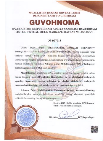 | 3083 | №007018 | Ilmiy asar - "AKSIYADORLIK JAMIYATI KORPORATIV BOSHQARUV TIZIMINI BAHOLASH USHUN SO‘ROVNOMA" (qayta ishlangan yangi versiya) | Ashurov Zufar Abdulloyevich (50%), Tashmatov Rustam Xusanovich (50%) | "O‘zbekiston Respublikasi davlat aktivlarini boshqarish agentligi huzuridagi Xususiylashtirish va davlat aktivlarini bоshqarish muammolarini tadqiq etish markazi" davlat muassasasi | 11/30/2023 | ![]() |