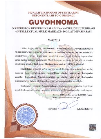 | 3082 | №007019 | Ilmiy asar - "METOДИKA CAMOOЦЕНКИ ЭФФЕКТИВНОСТИ ДЕЯТЕЛЬНОСТИ ЧЛЕНОВ НАБЛЮДАТЕЛЬНОГО СОВЕТА АКЦИОНЕРНОГО ОБЩЕСТВА" | Tashmatov Rustam Xusanovich (100%) | "O‘zbekiston Respublikasi davlat aktivlarini boshqarish agentligi huzuridagi Xususiylashtirish va davlat aktivlarini bоshqarish muammolarini tadqiq etish markazi" davlat muassasasi | 11/30/2023 | ![]() |