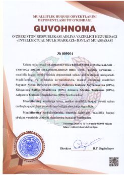 306 | №009017 | Ilmiy-ommabop asar (to‘plam) – "METROLOGIYA RIVOJIGA SALMOQLI HISSA QO‘SHGAN BUYUK SHARQ ALLOMALARI" | Jumanazarov Akmal Ruzikulovich (40%), Mamadaliyeva Naibaxon Saydaminovna (30%), Saidoripov Lazizbek Furkatjanovich (10%), Mamarasulov Xasan Kayumovich (10%), Valiyev Ruslan Anvar o‘g‘li (10%) | Jumanazarov Akmal Ruzikulovich, Mamadaliyeva Naibaxon Saydaminovna, Saidoripov Lazizbek Furkatjanovich, Mamarasulov Xasan Kayumovich, Valiyev Ruslan Anvar o‘g‘li | 19.06.2025 | ![]() |