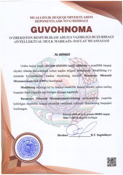 308 | №009015 | Ilmiy-ommabop asar – "STANDARTLARNI KASHF QILISH" | Jumanazarov Akmal Ruzikulovich (30%), Otaboyev Abdullajon Oybek o‘g‘li (5%), Usmanova Vasila Mamatkulovna (10%), Mamadaliyeva Naibaxon Saydaminovna (25%), Qodirov Doniyor Baxtiyorovich (10%), Samijonov Alisher Nigmatjon o‘g‘li (10%), Ziyodullayev Azizjon Ulug‘bek o‘g‘li (10%) | Jumanazarov Akmal Ruzikulovich, Otaboyev Abdullajon Oybek o‘g‘li, Usmanova Vasila Mamatkulovna, Mamadaliyeva Naibaxon Saydaminovna, Qodirov Doniyor Baxtiyorovich, Samijonov Alisher Nigmatjon o‘g‘li, Ziyodullayev Azizjon Ulug‘bek o‘g‘li | 19.06.2025 | ![]() |