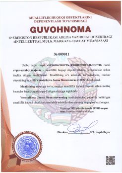 312 | №009011 | O‘quv-uslubiy majmua – "БЕЗОПАСНОСТЬ ЖИЗНЕДЕЯТЕЛЬНОСТИ" | Vorotnikova Janna Shuxratovna (100%) | Vorotnikova Janna Shuxratovna | 18.06.2025 | ![]() |