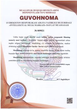 302 | №009021 | Bolalar uchun sarguzasht filmning ssenariy asari loyihasi – "DAYI" | Maxmudov Sardor Sarvar o‘g‘li (100%) | «KIDS CONTENT» mas’uliyati cheklangan jamiyati | 19.06.2025 | ![]() |