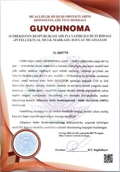 | 340 | №009779 | «SHOHSHODA» nomli badiiy adabiyotda yangi she‘riy janr | Allayorov Safar Xushvaqtovich - Safar OLLOYOR (100%) | Allayorov Safar Xushvaqtovich - Safar OLLOYOR (100%) | 01/06/2026 | ![]() |