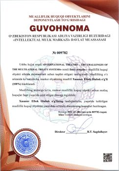 | 337 | №009782 | Ilmiy maqola – "INTERNATIONAL TREATIES – THE CHALLENGES OF THE MULTILATERAL TREATY SYSTEMS" | Xasanov Elbek Otabek o‘g‘li (100%) | Xasanov Elbek Otabek o‘g‘li (100%) | 01/08/2026 | ![]() |